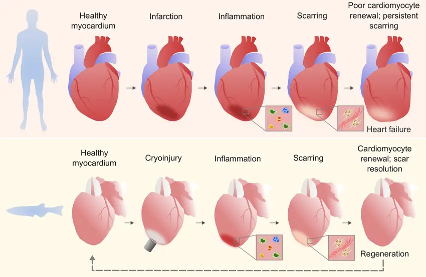 When the heart is injured (for example by myocardial infarction, MI), the outcome regeneration versus scar formation and heart failure depends on coordinated responses of multiple cell types and their timing. Bulk RNA measurements blur these contributions. Single-cell (scRNA-seq) and single-nucleus (snRNA-seq) approaches recover cell-type specific transcriptional changes, capture rare subpopulations, and allow reconstruction of dynamic trajectories (activation, proliferation, transdifferentiation) that occur during acute and chronic phases of injury. Combining these data with spatial transcriptomics places cell states back into tissue context crucial for understanding how cellular neighborhoods influence fate decisions.